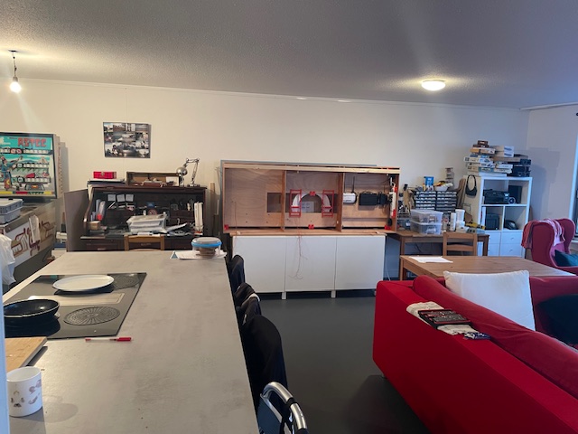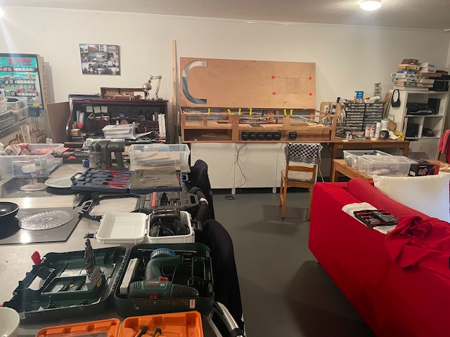 Ondertussen transformeert mijn woonkamer elk weekeind in een soort werkplaats. Dat ruim ik dan aan het eind van de zondag weer allemaal op. In de toekomst zal dat veel minder nodig zijn, want al het grove werk is nu echt achter de rug. Nu alle rail leggen en fijne spullen aansluiten, daarna gaan we over tot het bouwen van een landschap.