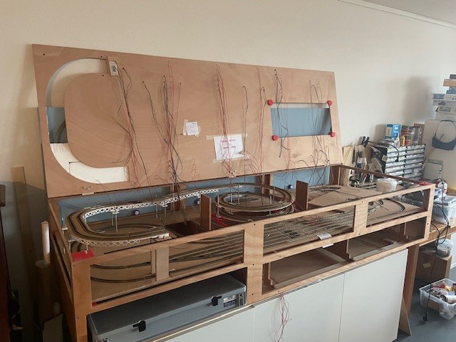Alles is klaar, het “deksel” voor de begane grond open. Zo kan ik makkelijk bij de sporen (die nog moeten komen) op niveau min één en bij de bedrading onder de begane grond.