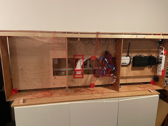 de bedrading van de onderkant in wording.Detail van de kabelboom die van de “begane grond” komt en die nog moet worden aangesloten op de bedienende elementen.