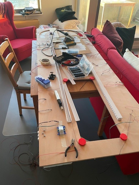 Voor de “begane grond” is dat nu helemaal gebeurd, voor het ondergrondse schaduwstation pas voor de helft. Aan de onderkant van de begane grond levert dat een flinke kabelspaghetti op. Dan haal ik de “begane grond” los van zijn scharnieren, keer hem om en leg hem vlak neer. Dan kan ik op het gemak aan al die kabeltjes werken. En dat betekent voor nu: Zodanig verlengen dat ze straks, als de “begane grond” definitief aan het frame bevestigd is, doorgetrokken kunnen worden naar de besturing. Dat betekent inderdaad dat elke draad wel drie keer onderbroken kan worden en gesoldeerd moet worden, maar anders is het niet te managen.